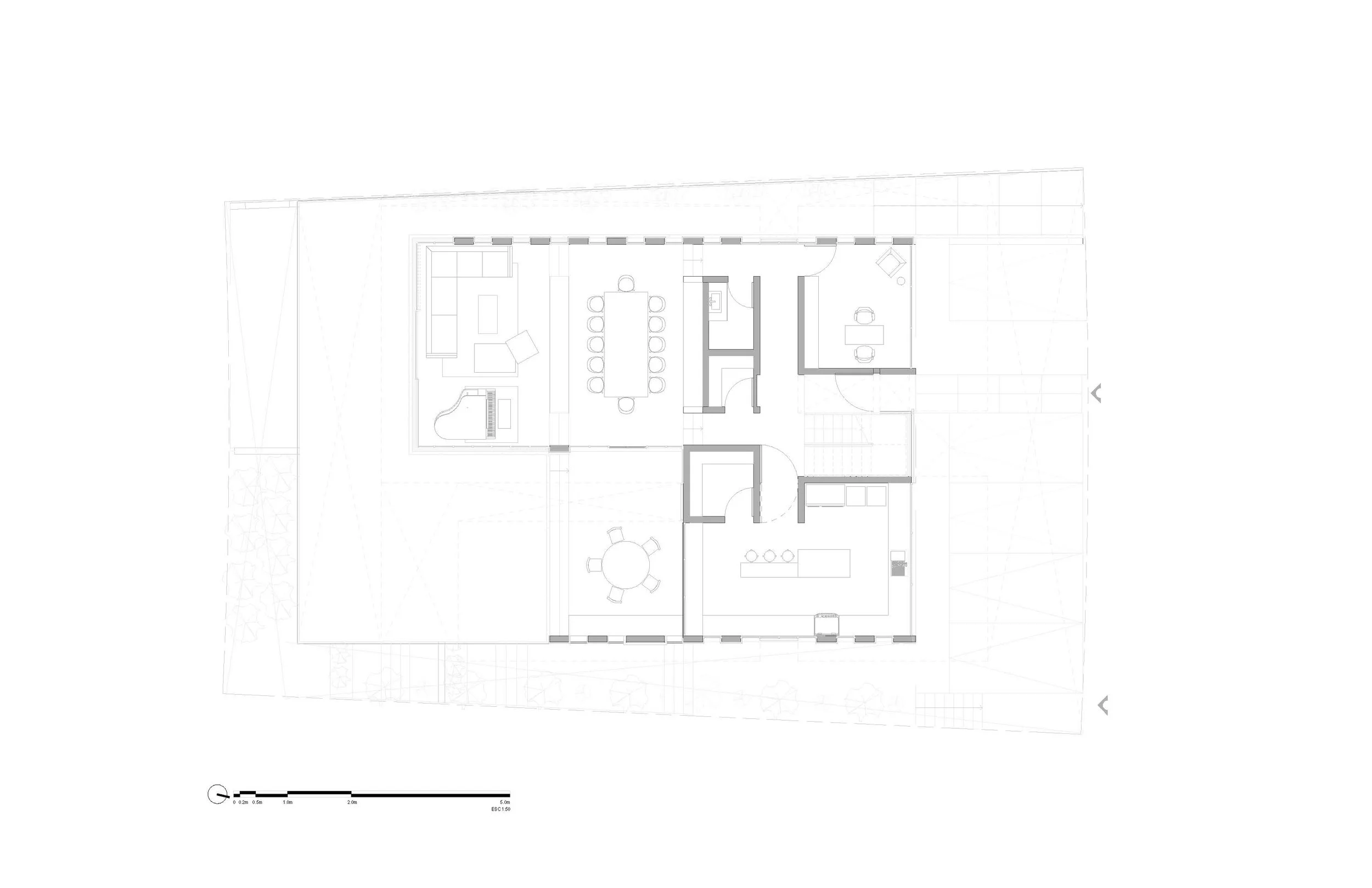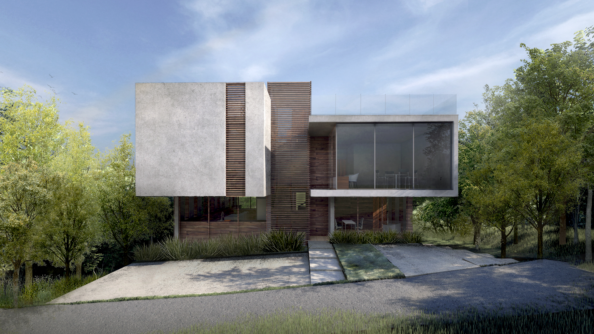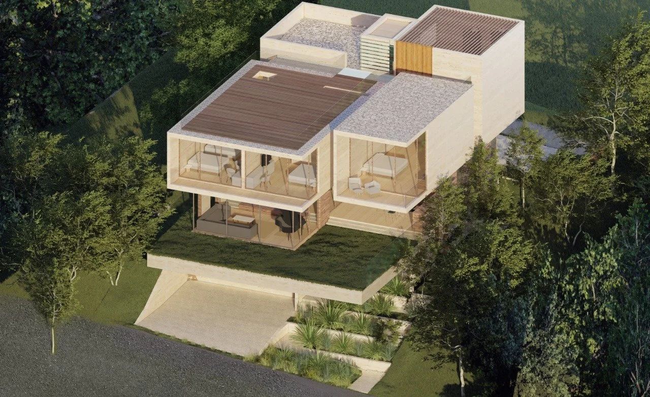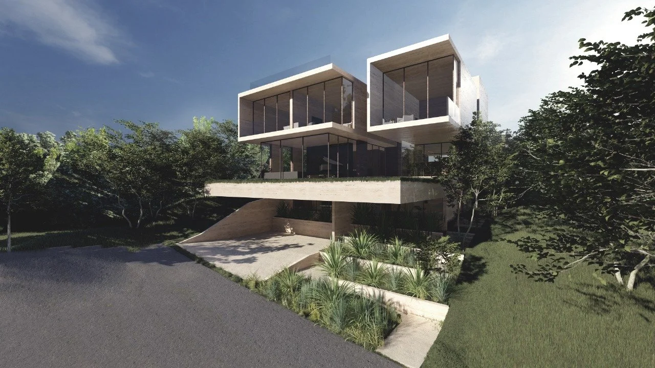 Casa familiar para una familia de 05 integrantes. El concepto adoptado para el desarrollo del proyecto es la levedad, que se busca a través de la materialidad de sus espacios. En planta, se concibe un área abierta y translúcida, permitiendo una total apertura y conexión entre sus espacios, así como con el jardín. Este volumen sirve como basamento de las áreas privadas, caracterizadas por una mayor intimidad en sus volúmenes, los cuales se conforman como bloques a modo de grapa, revestidos por placas que se despliegan a libro abierto. Se busca que cada uno de estos volúmenes, que constituyen el espacio superior, se asemeje a los monolitos de donde se extrae la misma piedra.